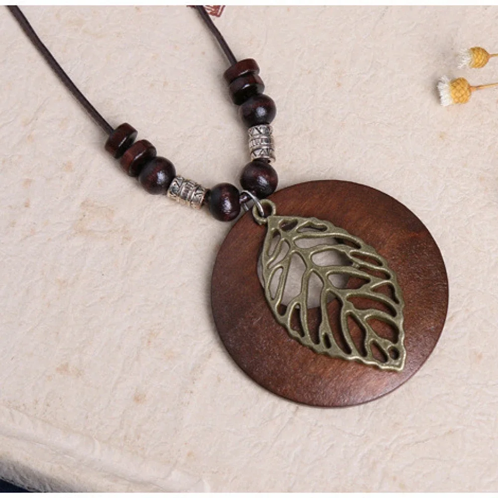 • Folk-style pendant necklace with wooden beads and zinc alloy accents